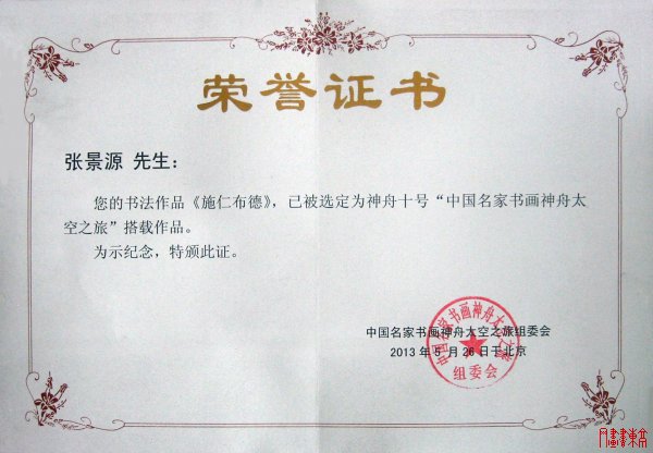 记者李娜报道:书法家张景源先生的书法作品《施仁布德》经专家评选,被选定为神舟十号“中国名家书画神舟太空之旅”搭载作品。登上“神十”圆满完成太空之旅,搭载成功,于6月份胜利返回。引起家乡人民和社会上的广泛关注。 几个月来,张景源先生应邀参加了北京总后二招、北京惠顾堂书画院、滨海新区创意文化产业协会、华夏张氏书画院、韩国书艺碑林协会、中国海监局天津总队等单位的文化交流活动。6月30日,北京张文台上将特约张先生去北京创作书法作品,山西省晋中市委宣传部、晋中市文化局,9月28日将为张先生举办书法展览。 天津书协主席唐云来先生在评价张景源先生时写道“津门宝坻,人杰地灵,才人代出,文化弥长,景源张君,为人笃厚,处世谦和,教学相长,德艺双馨,为当今书坛所重,致使书风日进,佳构颇丰,人品书品,世皆瞩目,能如此者,当今书坛能有几人乎?” 确实如唐先生所云,张景源先生多年来潜心翰墨,成绩斐然。2011年巨幅作品《念奴娇•赤壁怀古》被人民大会堂收藏。2012年,中央电视台记者对景源先生做了专访,视频在全国十大网站播放。今年作品又登上“神十”,实属家乡的骄傲,既弘扬了民族文化,又为家乡人民争了光,成了津门书法家作品登上“神十”第一人。祝福张景源先生取得更加辉煌的成就。 |