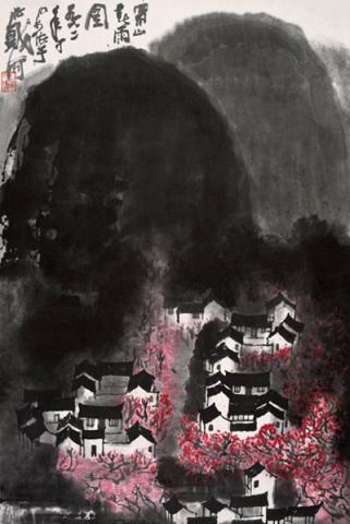 上世纪六十年代初,随着可染长途写生心灵体验的深化,人生历程的丰富、拓展、扩大,审美观念也在激变演进,非同往昔。除了早年为之神迷心醉的西湖之美,他再度为长居八年之久、历经战争岁月的蜀山之美所吸引,《蜀山春雨图》的出现,可以说,蕴含着可染山水艺术从古典形态向现代形态转型的新观念、新走向。他说:“过去我曾感到西湖风景好,但要与四川相比,却相差很远,大异其趣。《兰亭序》称山阴风景‘此地有崇山峻岭,茂林修竹’,其实这种景象在蜀地到处可见。”可染晚年《自传•提纲》中的这段话,可能帮助我们窥见其探索自然美,审美观念变迁的些许奥秘。和早一些的《江南春雨图》比较,《蜀山春雨图》不是淡淡一片春色,没有渔船舟子,没有小桥流水,却生出另一种激情与神奇:忽然放手泼墨,浓浓墨华,泼出数重山,对比着点厾胭脂红的灿烂花树,显得蜀山巍峨,春雨霏霏。盘山民居,黑的瓦,白的墙,被新雨笼罩,被花树环绕,益发明丽,愈发宁静,弥漫着温润清新空气,令人豁然畅怀。可染论画以为中国画高层次审美境界“不仅画所见,而且画所知、所想”,道破了古代画论“造化”与“心源”的深层关系。由此,他的山水画从“写景”跃向“造境”,更注重写心源、写大意、写山水精神了。