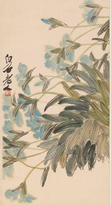 在中国传统绘画中,花鸟画作为重要分类之一,一直被赋予着吉祥的寓意和精神的象征,花卉题材大多局限于梅、兰、竹、菊,荷花、牡丹来象征坚贞、高洁、清逸、富贵等等美好的寓意。这种状况一直延续到齐白石时代,他彻底打破了传统题材的局限,将取材范围延伸到了传统之外,冲破了元明清以来文人绘画的孤芳自赏,使文人绘画有了人间烟火。白石老人笔下的一花一鸟一枝一叶,无不透露着对美好生活的体验和向往,充盈着生命的欢愉。齐白石以拙朴、自然、洒脱的真性情作画,不媚俗不泥古,从真实的生活里提炼出属于他个人的画艺、画趣与画境,使得他的画作里既有着文人艺术的妙曼,又有着民间艺术的朴素。单纯明丽的色彩,稚拙朴素的造型和笔法,工笔与写意的结合,平中见奇的构图,作为齐白石独特的艺术语言,将原本普通的花鸟草虫题材画出闲适清淡的生活趣味,营造出一个纷繁多姿的艺术天地。