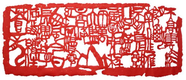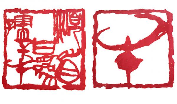 一张普通的红纸,不用任何工具,凭着灵巧的手,几经撕扯之后,就成了一幅令人喜爱的撕纸作品。大红的颜色、金石的韵味、巧妙的构思、齐谲的章法,纸在这里升华,篆刻之美在这里绽放,这就是金石撕纸艺术。