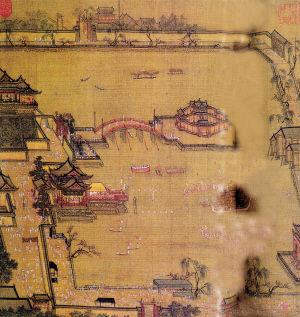 金明池坐落在北宋东京汴梁顺天门外(今河南开封城西),是当时著名的御苑之一。每年三月由皇帝赐令开放,并与士庶于此共观龙舟争标,郊游赏玩,成为京城一大盛事。靖康之变后,赵宋王朝南渡,“争标赐宴”则成为历史的陈迹,不复存在。因此传世近千年的北宋著名画家张择端所作《金明池争标图》成为我们领略当日繁华胜境的最直观方法。