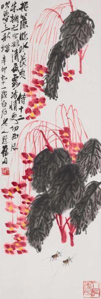 此件《海棠秋趣》为白石老人晚年时所作,红花墨叶配以昆虫点缀,自有一番田园乐趣。秋天本是令人惆怅的季节,而在作者笔下却是另有一种生命蓬勃的气息:两棵海棠自上而下队列式排列,海棠花开,柠檬黄的花蕊让画面显示出跳跃的动感;如柳枝般垂挂的枝条,安静中不乏妩媚;几片硕大的叶子以淡墨挥就,再以渴笔点出叶脉,粗中见细;两只蚂蚱于海棠树下低头觅食,又或是在窃窃私语,栩栩如生,灵气十足。