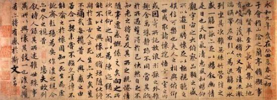 《兰亭集序》全文28行、324字,通篇遒媚飘逸,字字精妙,有如神助。如其中的20个“之”字,竟无一雷同,成为书法史上的一绝。以后他多次重写,皆不如此次酒酣之作,被历代书界奉为极品。宋代书法大家米芾称其为“中国行书第一帖”,但是,就是这件“贵越群品,古今莫二”的书法极品,直到如今,其下落仍然扑朔迷离,令人无法不惋惜。