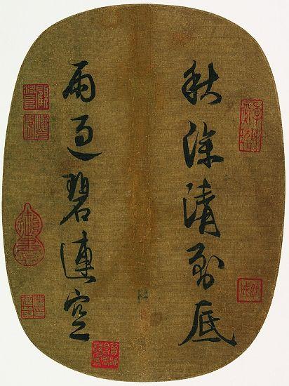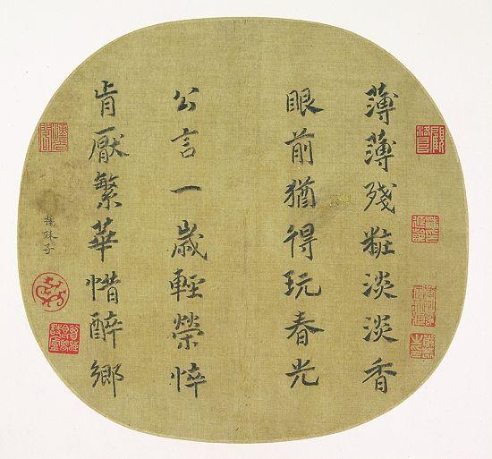 展出的高宗(1107-1187年)书法墨韵为大都会博物馆藏《草书天山阴雨七绝诗页》(23.5×24.4厘米),绢本墨笔,如果说现藏东京国立博物馆的高宗《行书赐梁汝嘉勒书卷》是其中年佳作而遗存“黄字”墨韵的话,那么这件草书团扇的字里行间在得“王字”墨韵之上,更显开朝皇帝处世的那份自信、独到和圆滑。