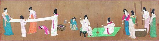 赵佶珍品2件,《摹张萱捣练图卷》(37.1×145厘米),绢本设色和《五色鹦鹉图卷》(53.3×125.1厘米)绢本设色,均来自波士顿美术馆。