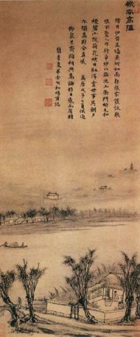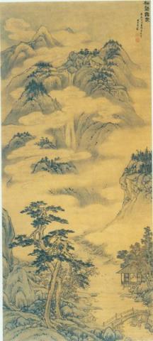 《山水图》轴:现藏于上海博物馆,纵327.9厘米,横106.8厘米,纸本设色。画境广阔深远,气象万千。所绘高山耸峙,巨峰凌空,山头乱石累累,白云飘渺间一瀑布如白练飞溅而下,山底溪流蜿蜒曲折,两岸怪石嶙峋,丛树群生,青松茂密;溪流旁有木屋数间隐映于密树之中,屋内有人凭轩眺望山色。图中山石勾染,皴法多用秃笔中锋,枯树、苍松勾勒细致自如,所画木屋、人物虽小,却形神皆备,意趣横生。整幅画构图高远,秀逸古拙,意境冷峭幽深,笔法工细严谨,苍中带秀,平中求奇,静中寓动,色泽清新妍丽,别具神韵。
