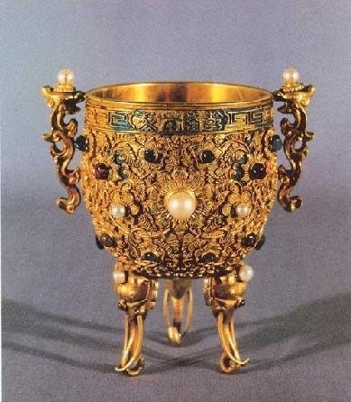 宫廷之宝乾隆款金瓯永固杯。乾隆款金瓯永固杯为故宫宫廷文物的代表作。高12.5厘米,口径8厘米,足高5厘米,口边刻有回纹。根据清“内务府活计档”记载,乾隆皇帝对此杯的制作十分重视,不仅调用内库黄金、珍珠、宝石等珍贵材料,而且精工细作,曾多次修改,直至皇帝满意为止。因此,该杯一直被清代皇帝视为珍贵的祖传法宝。“金瓯”寓意国家政权,取名“金瓯永固”则反映永远巩固地保持政权的一种愿望。它是清代皇帝每年元旦(大年初一)举行开笔仪式时专用的酒杯。每当元旦子时,皇帝在养心殿,把“金瓯永固杯”放在紫檀长案上,倒入屠苏酒,亲燃蜡烛,提起毛笔写下祈求江山社稷平安永固的吉语。