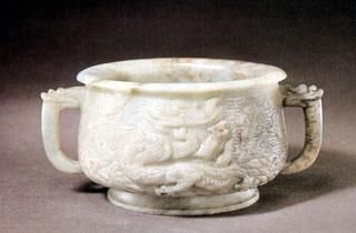 玉器之宝青玉云龙纹炉。青玉云龙纹炉为故宫玉器的代表作品。宋代出品,高7.9cm,口径12.8cm。炉青玉质。通体以“工”字纹为底,上饰游龙、祥云和海水纹。器内底阴刻乾隆七言诗一首:“何年庙器赞天经,刻作飞龙殿四灵。毛伯邢侯异周制,祖丁父癸似商形。依然韫匵阅桑海,所惜从薪遇丙叮土气羊脂胥变幻,只余云水淡拖青。”