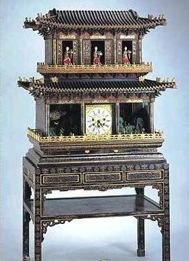 钟表之宝彩漆描金楼阁式自开门群仙祝寿御制钟。彩漆描金楼阁式自开门群仙祝寿御制钟为故宫钟表的代表作。高185cm,面宽102cm,侧宽70cm。此钟共有7套机械系统,分别控制走时、报时、景箱内的活动装置等,技术水准相当高。根据记录,从乾隆八年接旨着手设计到十四年完工,历时五年多。17世纪前,中国皇宫一直以铜壶滴漏计时。意大利传教士利玛窦带着两个西洋自鸣钟叩开了中国宫廷的大门。