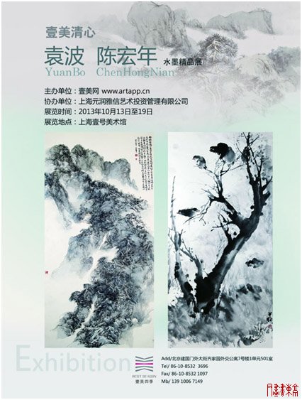 “壹美清心——袁波、陈宏年水墨精品展”于2013年10月13日在上海壹号美术馆隆重拉开帷幕。 展览由北京壹美四季文化传播有限公司、壹美网(www.artapp.cn)及上海一号美术馆两家专业艺术机构共同主办,展览历时7天,届时展出袁波、陈宏年两位当代实力派艺术家的精品力作。 在此,诚挚邀请您光临与关注。关注壹美四季,关注壹美微信(微信ID:artapp), 期望展览能够让各界的同仁领略到非同一般的赏心与悦目!